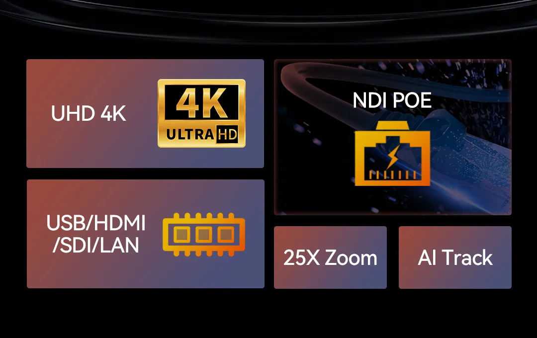 Delivers stunning 4K resolution and a 25X lossless optical zoom for a powerful imaging solution. Perfect for a wide range of applications, from conferences to live streaming, with advanced AI human form tracking technology for superior performance.